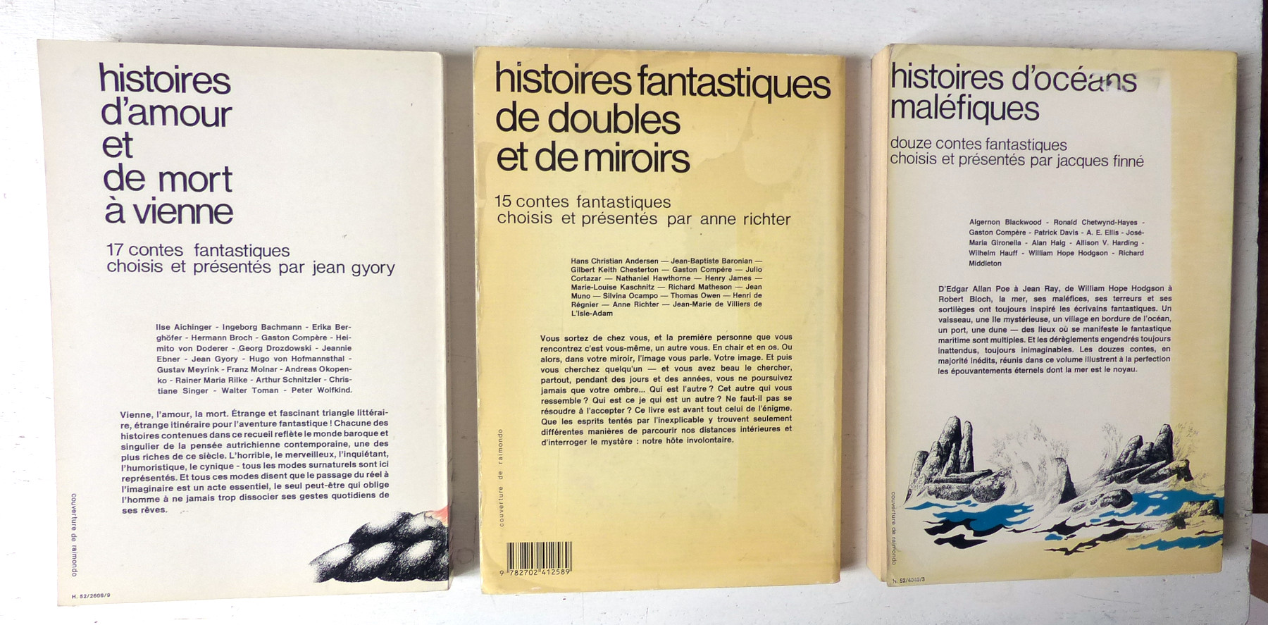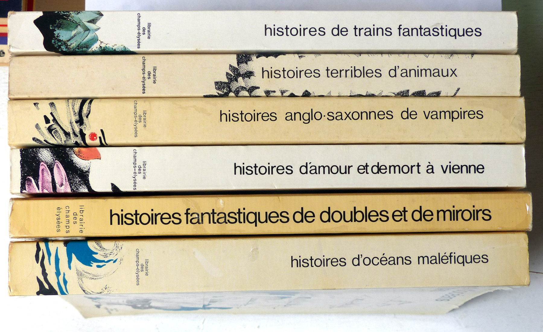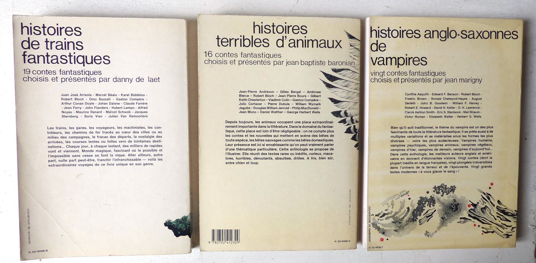 5 anthologies thématiques, avec préface ou introduction: Histoires fantastiques de doubles et de miroirs (15 contes fantastiques choisis et présentés par Anne Richter), Histoires de trains fantastiques (19 contes fantastiques choisis et présentés par Danny de Laët), Histoires anglo-saxonnes de vampires (20 contes fantastiques choisis et présentés par Jean Marigny), Histoires d'amour et de mort à Vienne (17 contes fantastiques choisis et présentés par Jean Gyory), Histoires terribles d'animaux (16 contes fantastiques choisis et présentés par Jean-Baptiste Baronian)