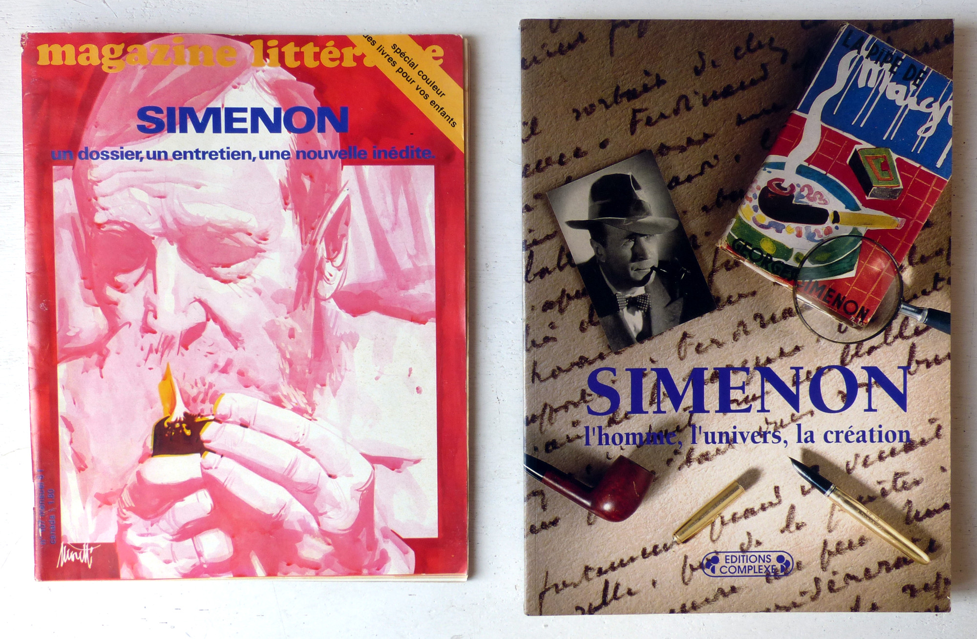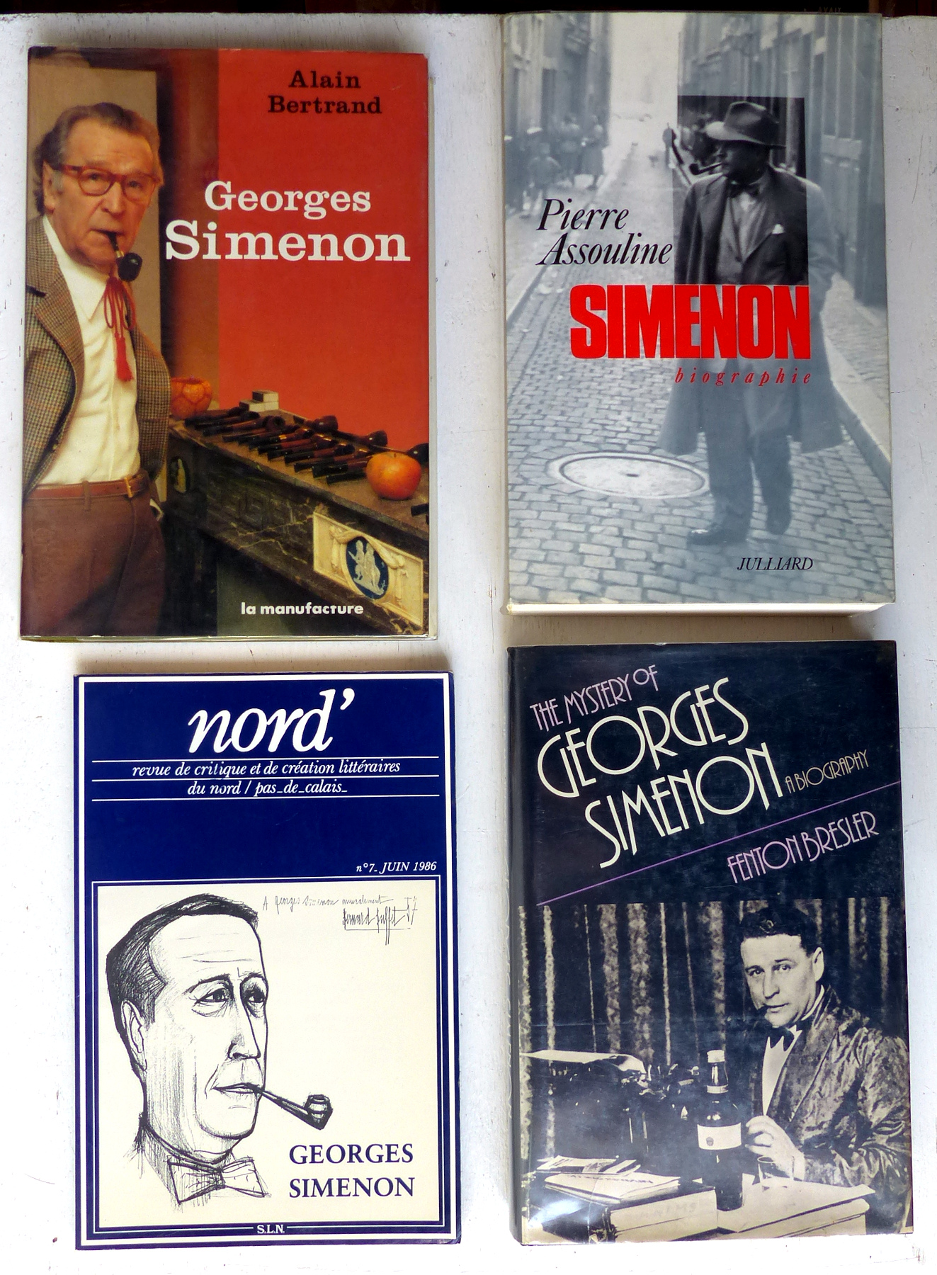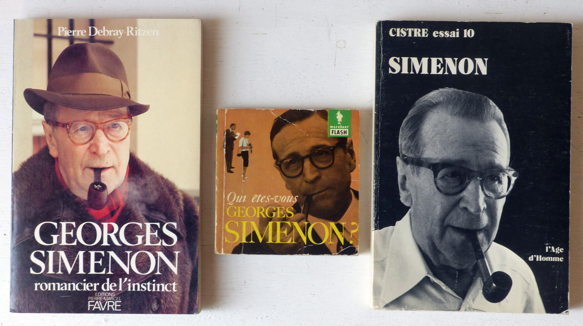 Ensemble de 13 ouvrages consacrés à Georges Simenon et à son oeuvre, et au personnage du commissaire Maigret:1/ Qui êtes-vous, Georges Simenon? par Léon Thoorens (éditions Gérard & C°, Marabout-Flash n°21, 1959, 160 p.); 2/Entretien avec Roger Stéphane (RTF & Librairie Jules Tallandier, collection Portrait Souvenir, 1963, 190 p.); 3/ Dossier Simenon (Magazine littéraire n°107, décembre 1975); 4/ Simenon (éditions L'Âge d'Homme, collection Cistre Essais n°10, 1980, 295 p.); 5/ Le mystère Simenon, par Denis Tillinac (Calmann-Lévy, 1980, 228 p.); 6/ The Mystery of Georges Simenon (A Biography) par Fenton Bresler (Beaufort Books, 1983, 260 p. Texte en anglais); 7/ Dossier Simenon dans 'Nord' (Revue de critique et de création littéraire du Nord/Pas-de-Calais) n°7, juin 1986, 104 p. Contient 6 articles); 8/ Georges Simenon, par Alain Bertrand (La Manufacture, 1988, 294 p.); 9/ Georges Simenon romancier de l'instinct, par Pierre Debray-Ritzen (éditions Pierre-Marcel Favre, 1989, 189 p.); 10/ Simenon (biographie) par Pierre Assouline (Julliard, 1992, 756 p.); 11/ Simenon: l'homme, l'univers, la création (catalogue d'exposition), par Bernard Alavoine, Pierre Assouline, Claude Menguy, etc. (éditions Complexe, 2002, 236 p.); 12/ Commissaire Maigret, qui êtes-vous? par Gilles Henry (Plon, 1977, 288 p.); 13/ La vraie naissance de Maigret, par Francis Lacassin (éditions du Rocher, 1992, 171 p.).