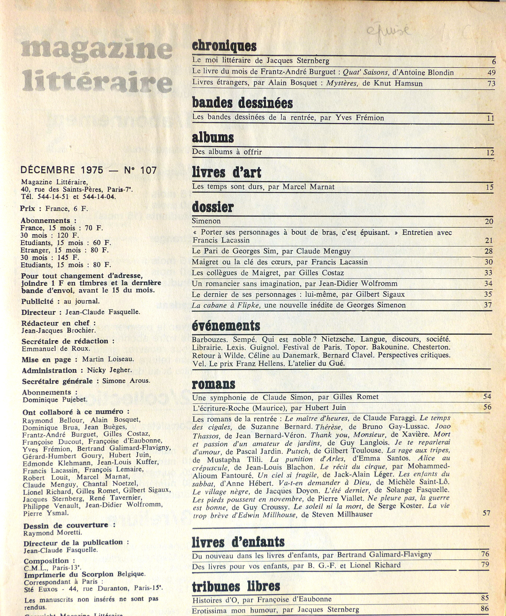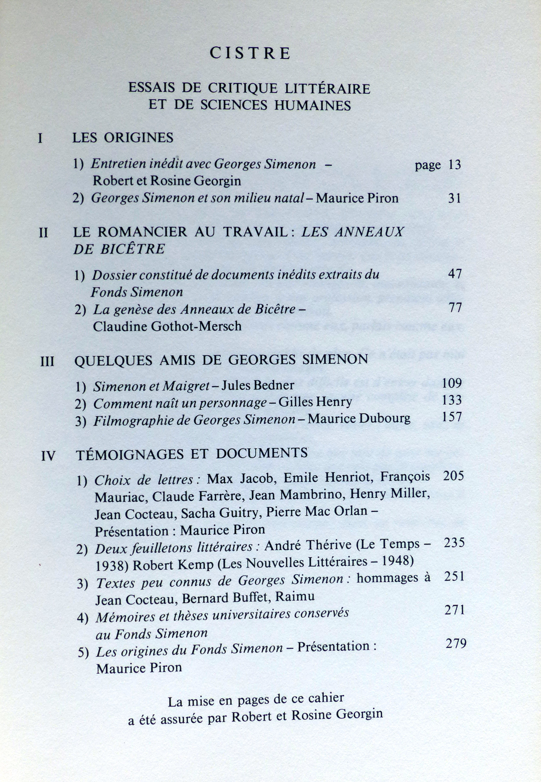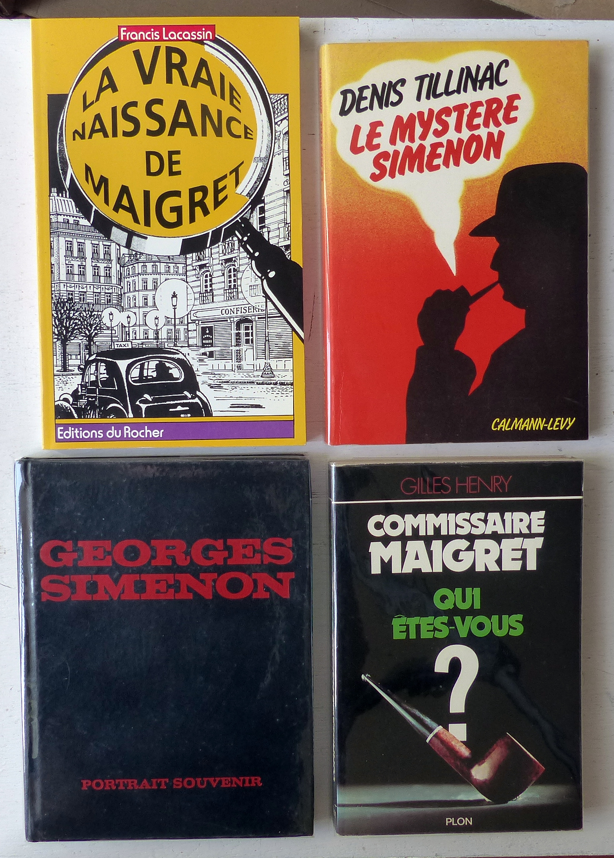 Ensemble de 13 ouvrages consacrés à Georges Simenon et à son oeuvre, et au personnage du commissaire Maigret:1/ Qui êtes-vous, Georges Simenon? par Léon Thoorens (éditions Gérard & C°, Marabout-Flash n°21, 1959, 160 p.); 2/Entretien avec Roger Stéphane (RTF & Librairie Jules Tallandier, collection Portrait Souvenir, 1963, 190 p.); 3/ Dossier Simenon (Magazine littéraire n°107, décembre 1975); 4/ Simenon (éditions L'Âge d'Homme, collection Cistre Essais n°10, 1980, 295 p.); 5/ Le mystère Simenon, par Denis Tillinac (Calmann-Lévy, 1980, 228 p.); 6/ The Mystery of Georges Simenon (A Biography) par Fenton Bresler (Beaufort Books, 1983, 260 p. Texte en anglais); 7/ Dossier Simenon dans 'Nord' (Revue de critique et de création littéraire du Nord/Pas-de-Calais) n°7, juin 1986, 104 p. Contient 6 articles); 8/ Georges Simenon, par Alain Bertrand (La Manufacture, 1988, 294 p.); 9/ Georges Simenon romancier de l'instinct, par Pierre Debray-Ritzen (éditions Pierre-Marcel Favre, 1989, 189 p.); 10/ Simenon (biographie) par Pierre Assouline (Julliard, 1992, 756 p.); 11/ Simenon: l'homme, l'univers, la création (catalogue d'exposition), par Bernard Alavoine, Pierre Assouline, Claude Menguy, etc. (éditions Complexe, 2002, 236 p.); 12/ Commissaire Maigret, qui êtes-vous? par Gilles Henry (Plon, 1977, 288 p.); 13/ La vraie naissance de Maigret, par Francis Lacassin (éditions du Rocher, 1992, 171 p.).