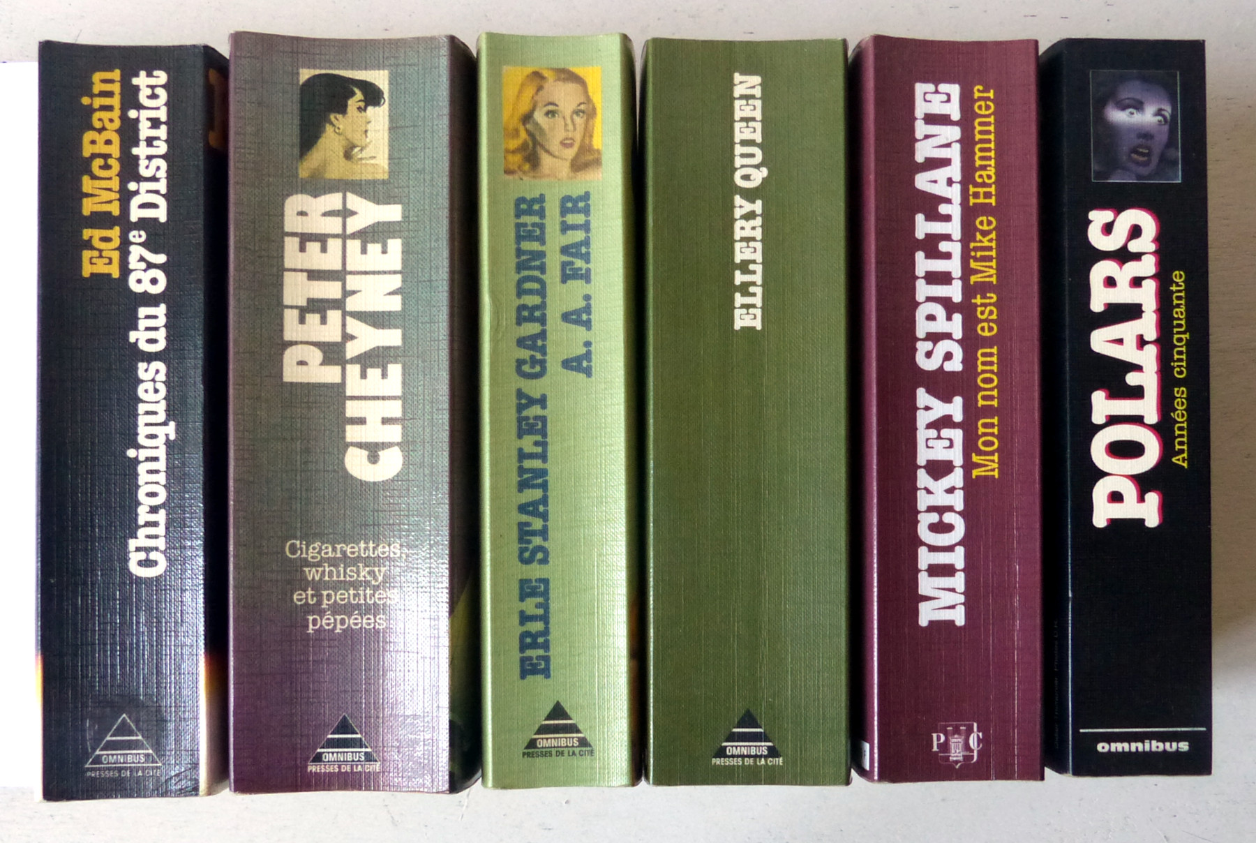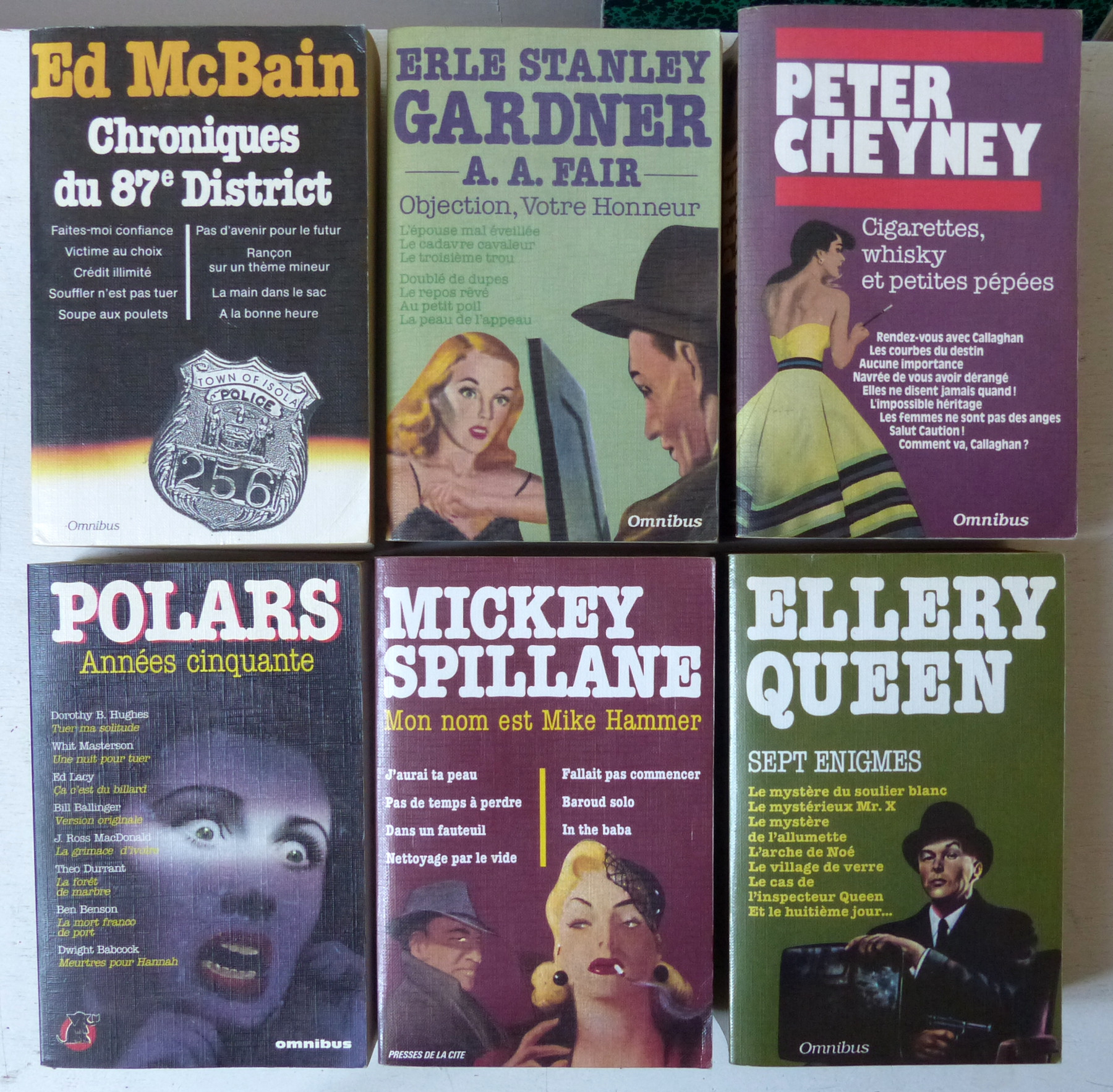 Ensemble de 6 volumes contenant chacun plusieurs romans et une préface. --Chroniques du 87e district, par Ed McBain (préface de Jacques Baudou; 9 romans; 1988, 830 pages); Sept énigmes, par Ellery Queen (préface de Maurice-Bernard Endrèbe, 7 romans; 1989, 1020 p.); Mon nom est Mike Hammer, par Mickey Spillane (préface de Jean-Claude Zylberstein, 7 romans; 1989, 892 p.); Cigarettes, whisky et petites pépées (préface de François Rivière, 8 romans; 1990, 1060 p.); Objection, votre Honneur, par Erle Stanley Gardner/A.A. Fair (préface de Maurice-Bernard Endrèbe; 7 romans des cycles Perry Mason et Bertha Cool/Donald Lam; 1990, 720 p.); Polars années cinquante (8 romans parus dans la collection Un Mystère, choisis et préfacés par Jacques Baudou; 1995, 1180 p.)