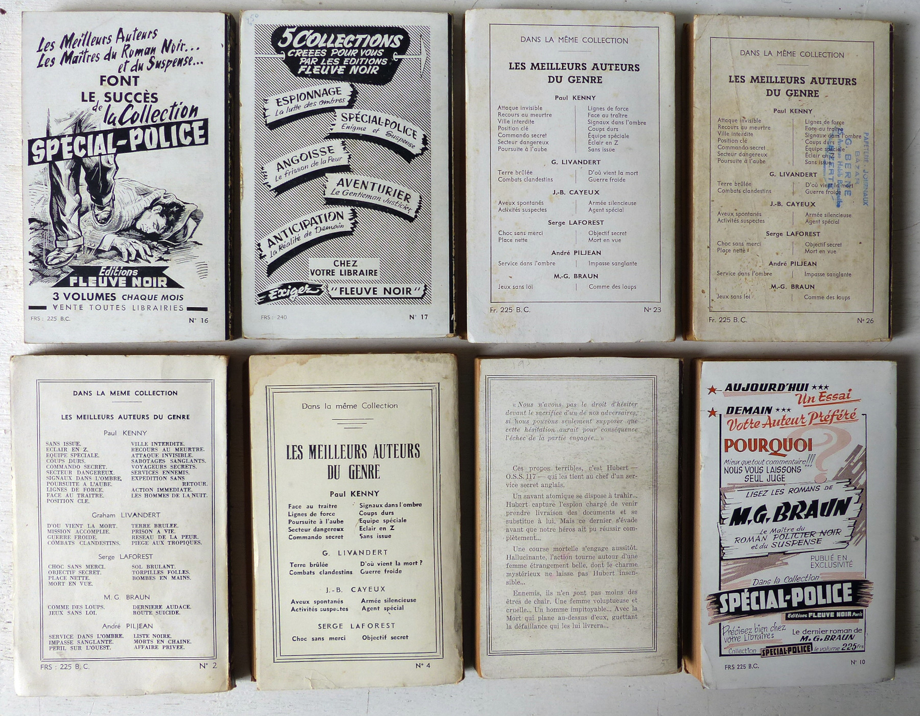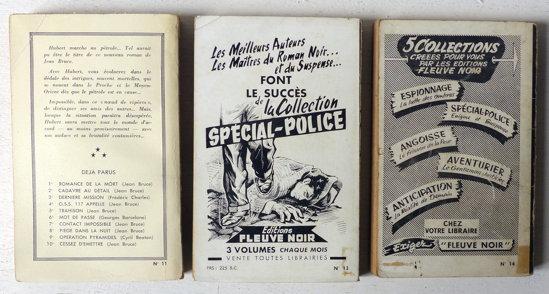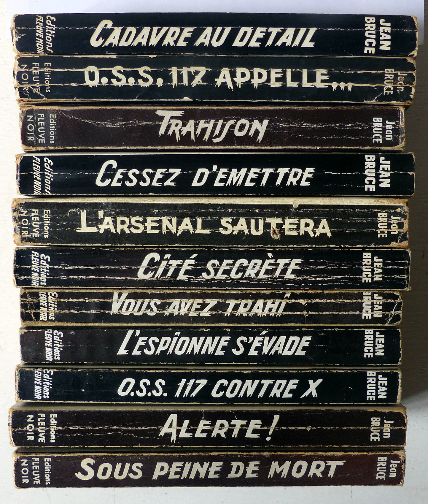 N°2/ Cadavre au détail; 4/ OSS 117 appelle; 5/ Trahison; 10/ Cessez d'émettre; 11/ L'arsenal sautera; 13/ Cité secrète; 14/ Vous avez trahi; 16/ L'espionne s'évade; 17/ OSS 117 contre X; 23/ Alerte; 26/ Sous peine de mort. --Tous ces titres sont en réédition.