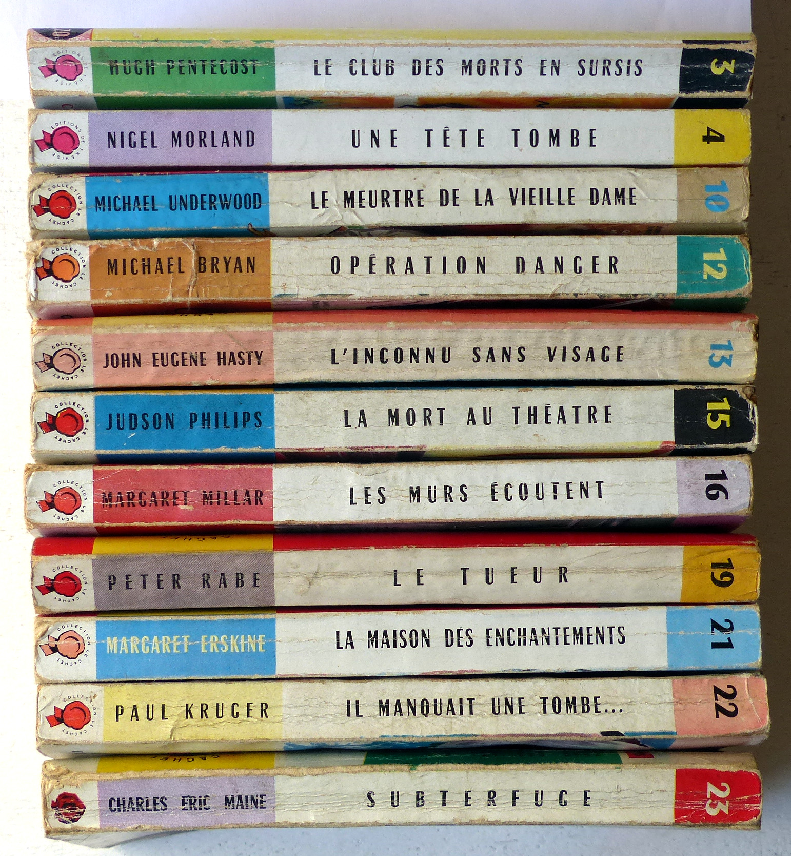 Ensemble de 11 romans (sur les 28 parus au total dans cette collection), par Hugh Pentecost, Nigel Morland, Michael Underwood, Michael Bryan, John Eugene Hasty, Judson Philips, Margaret Millar, Peter Rabe, Margaret Erskine, Paul Kruger, Charles Eric Maine. N°3-4-10-12-13-15-16-19-21-22-23 (le détail des titres est visible sur les photos associées à l'annonce)