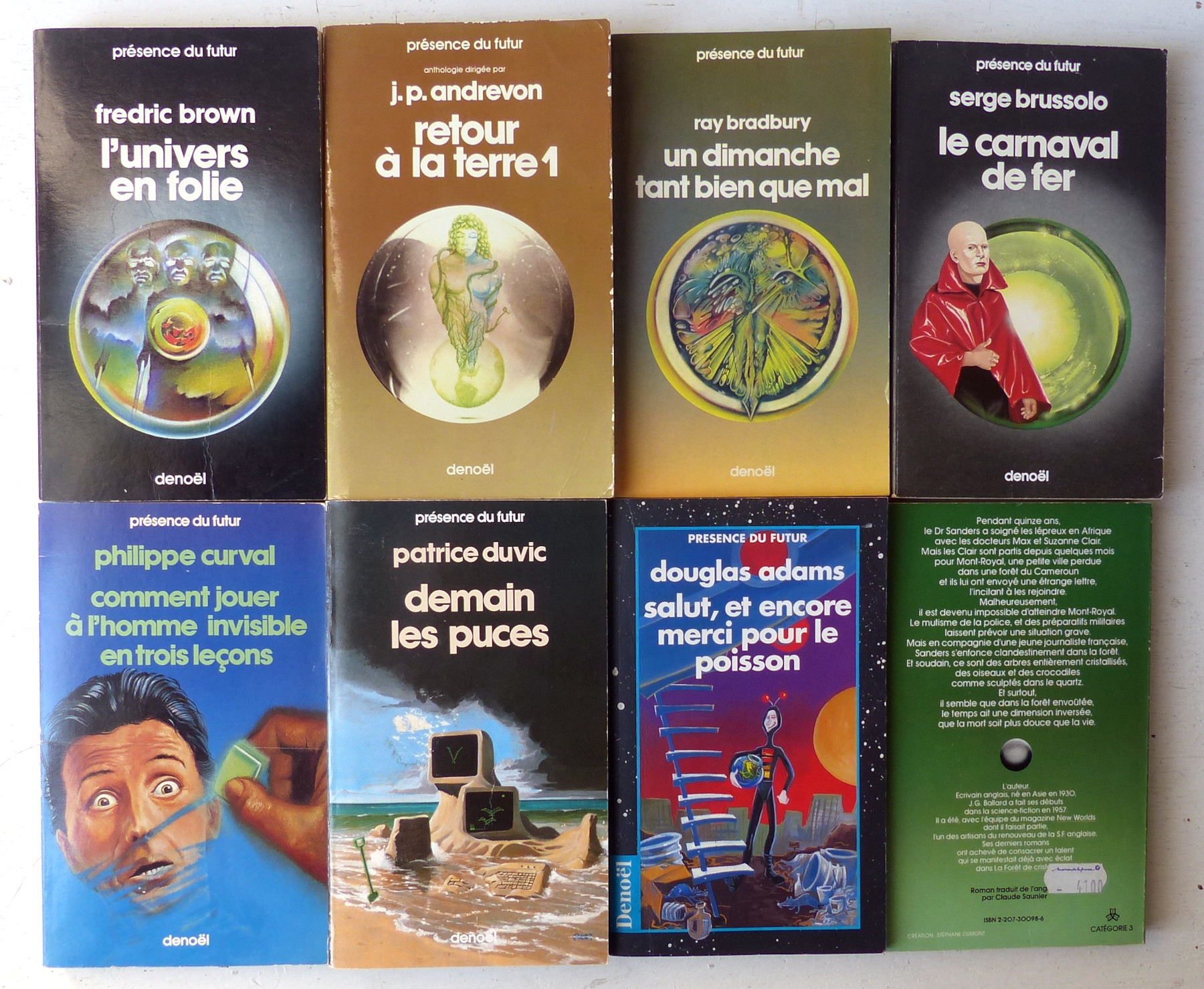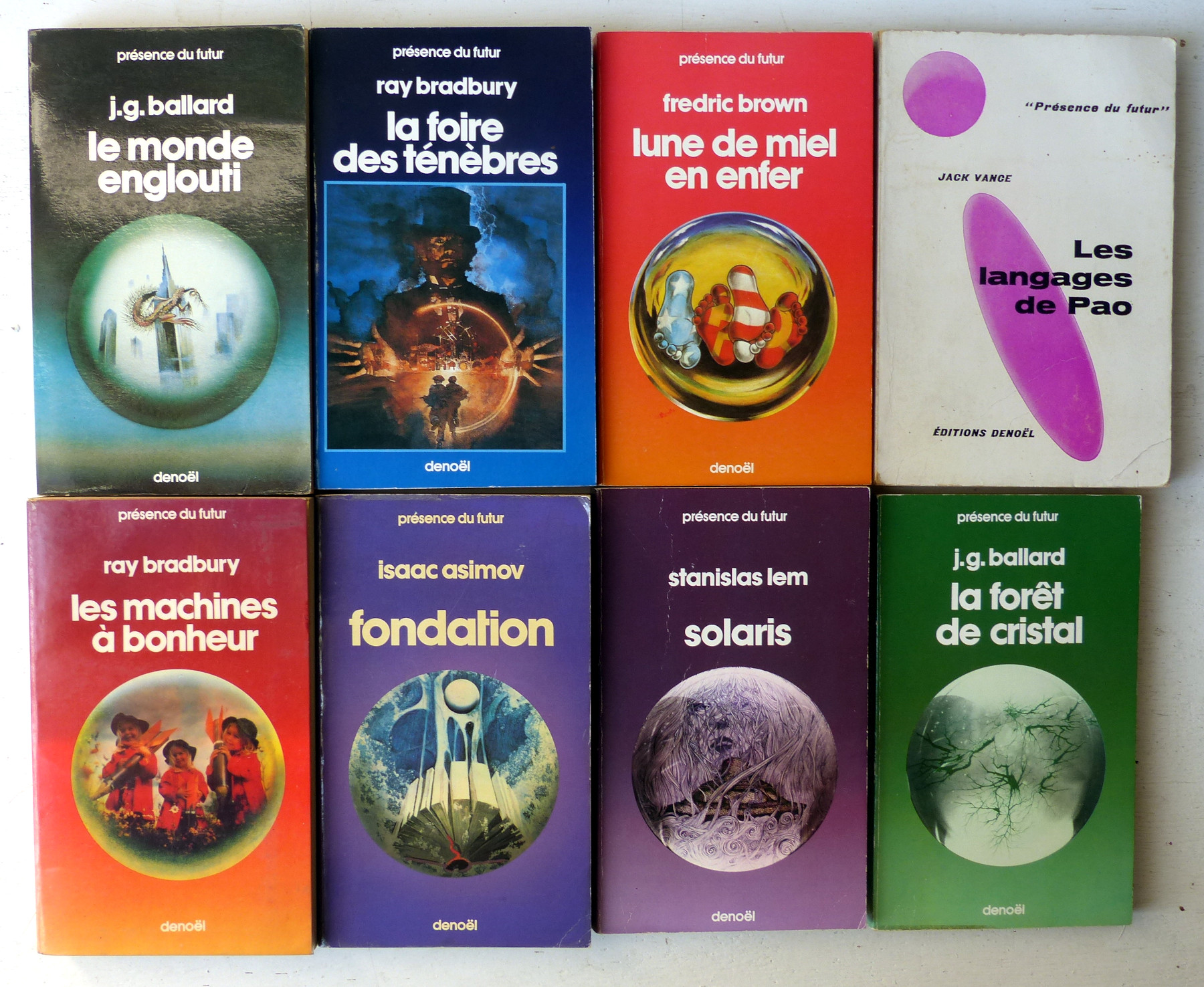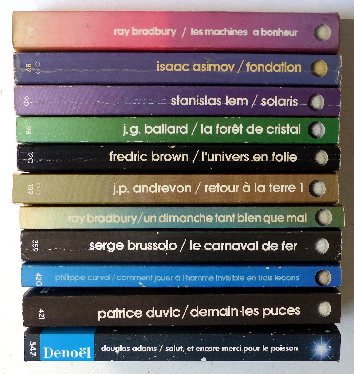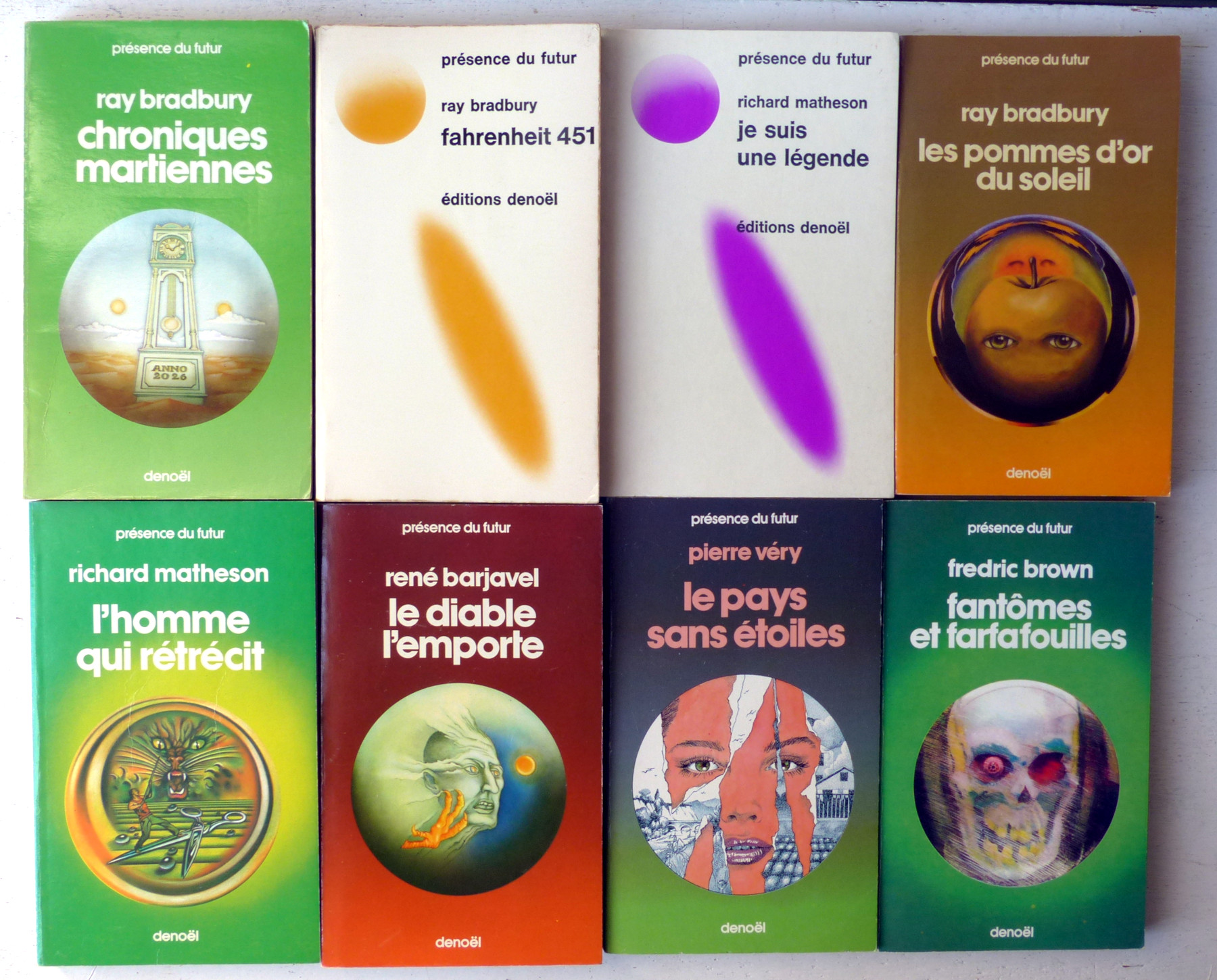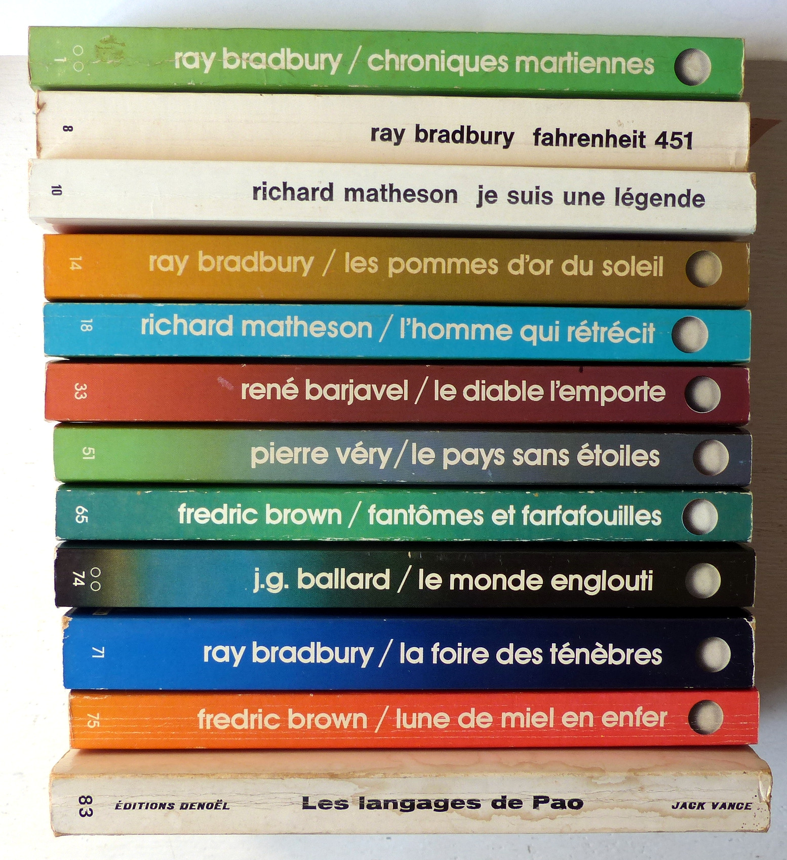 23 romans et recueils de nouvelles, par Ray Bradbury, Richard Matheson, René Barjavel, Fredric Brown, Pierre Véry, J.G. Ballard, Jack Vance, Isaac Asimov, Stanislas Lem, J.P. Andrevon, Serge Brussolo, Philippe Curval, Patrice Duvic, Douglas Adams. N°1-8-10-14-18-33-51-65-71-74-75-83-84-89-90-98-120-189-272-359-420-421-547 (le détail des titres est visible sur les photos associées à l'annonce)