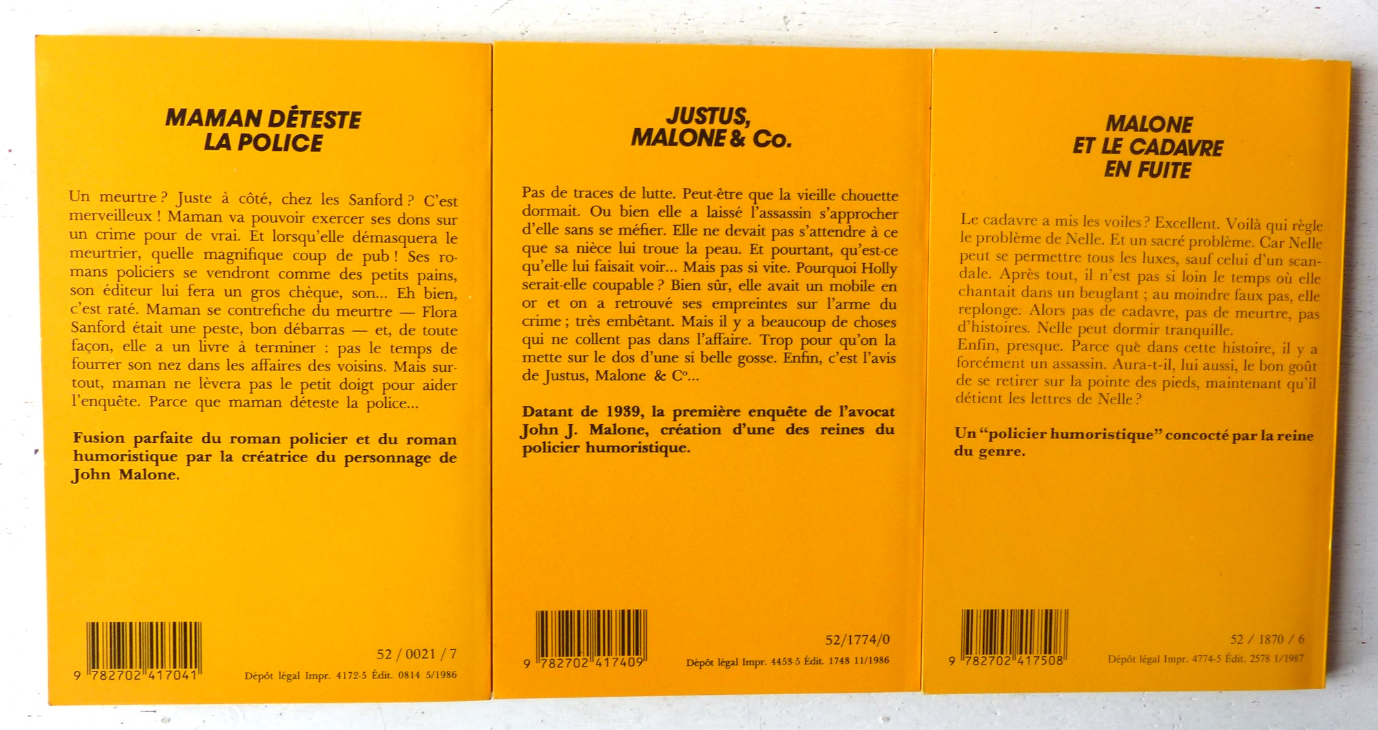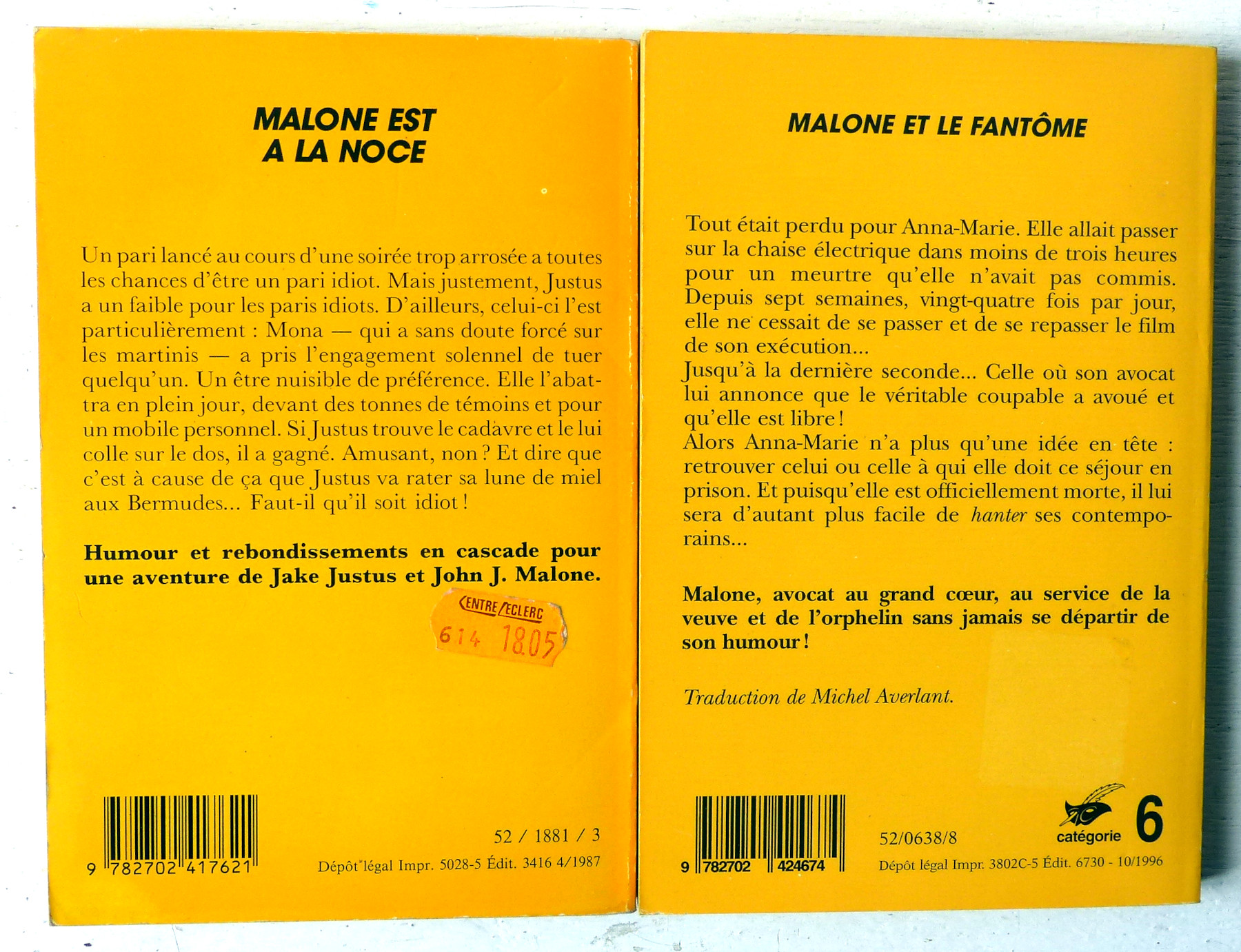 Ensemble de 5 romans, dont 4 de la série John J. Malone: n°1835-1862-1870-1881-2297. Maman déteste la police; Justus, Malone & C°; Malone et le cadavre en fuite; Malone est à la noce; Malone et le fantôme.