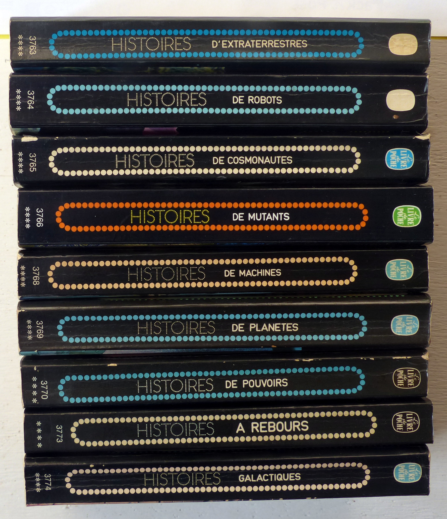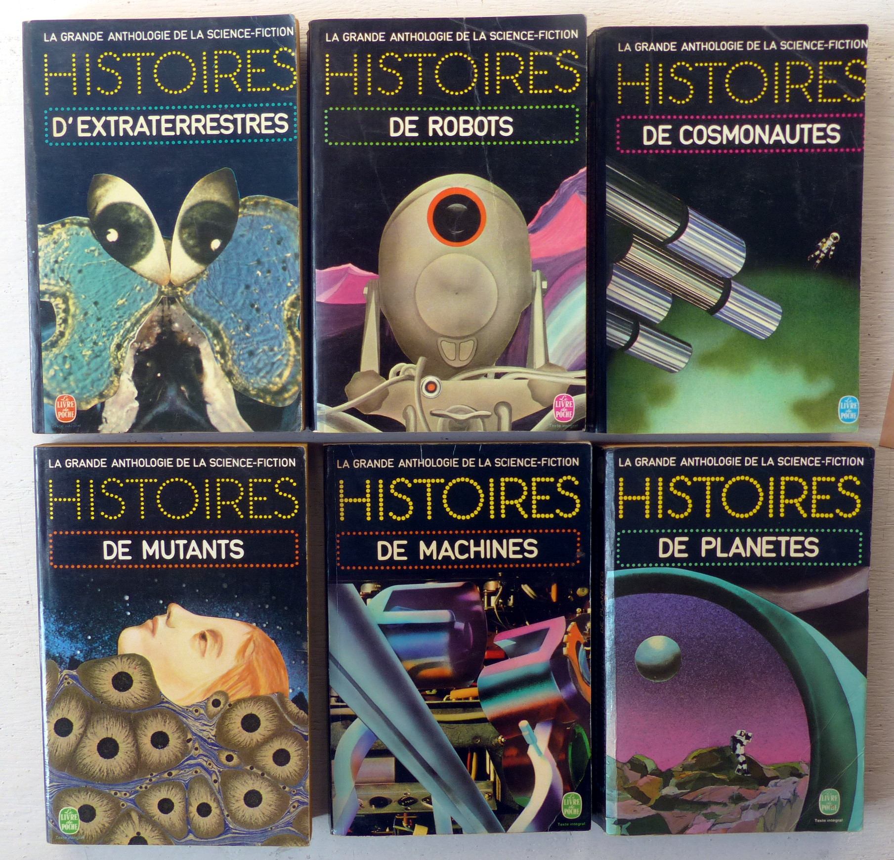 Ensemble de 9 volumes de cette série d'anthologies thématiques, réunies et présentées par Gérard Klein, Demètre Ioakimidis et Jacques Goimard: n°3763-3764-3765-3766-3768-3769-3770-3773-3774. Histoires d'extraterrestres, de robots, de cosmonautes, de mutants, de machines, de planètes, de pouvoirs, à rebours, galactiques.