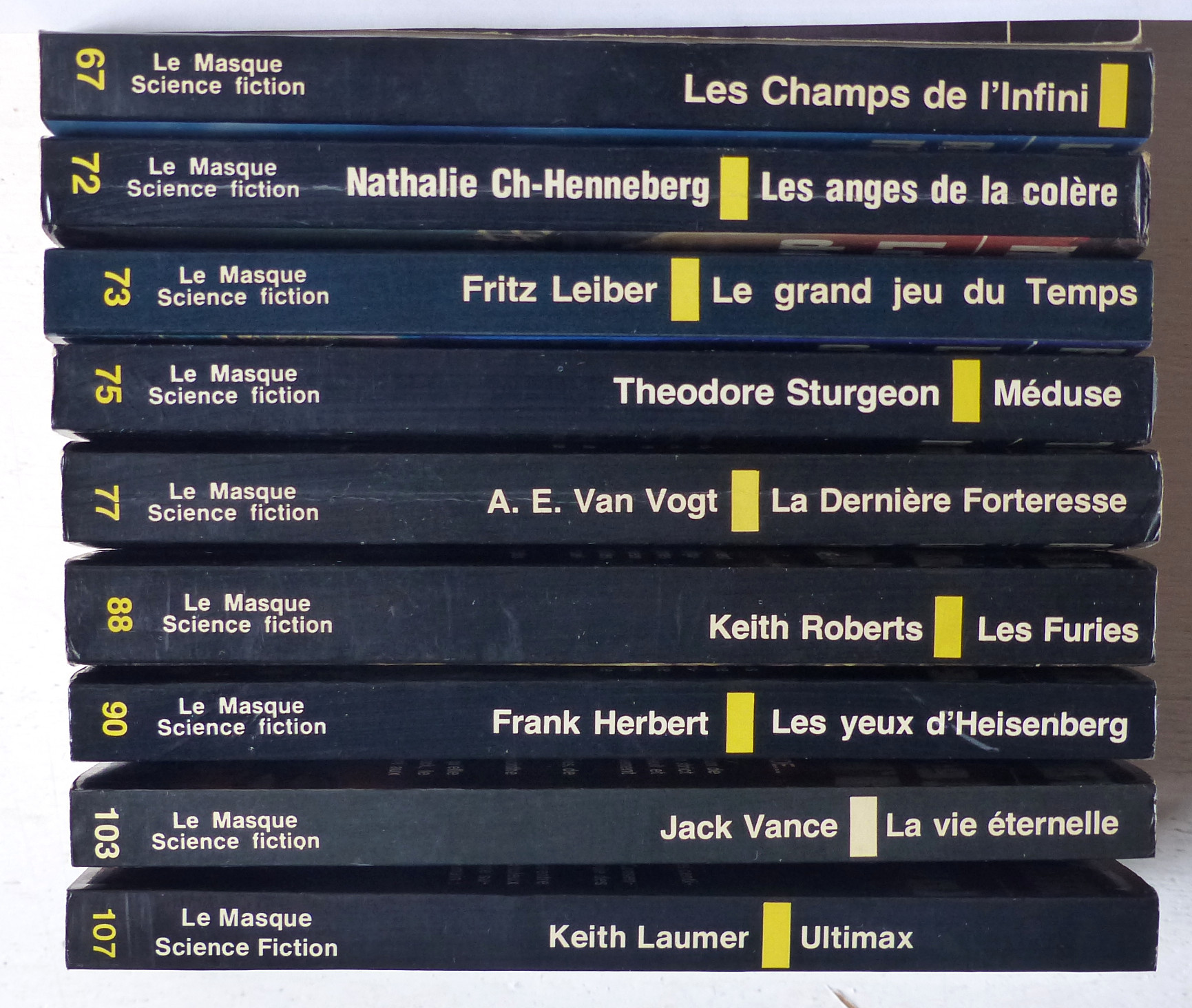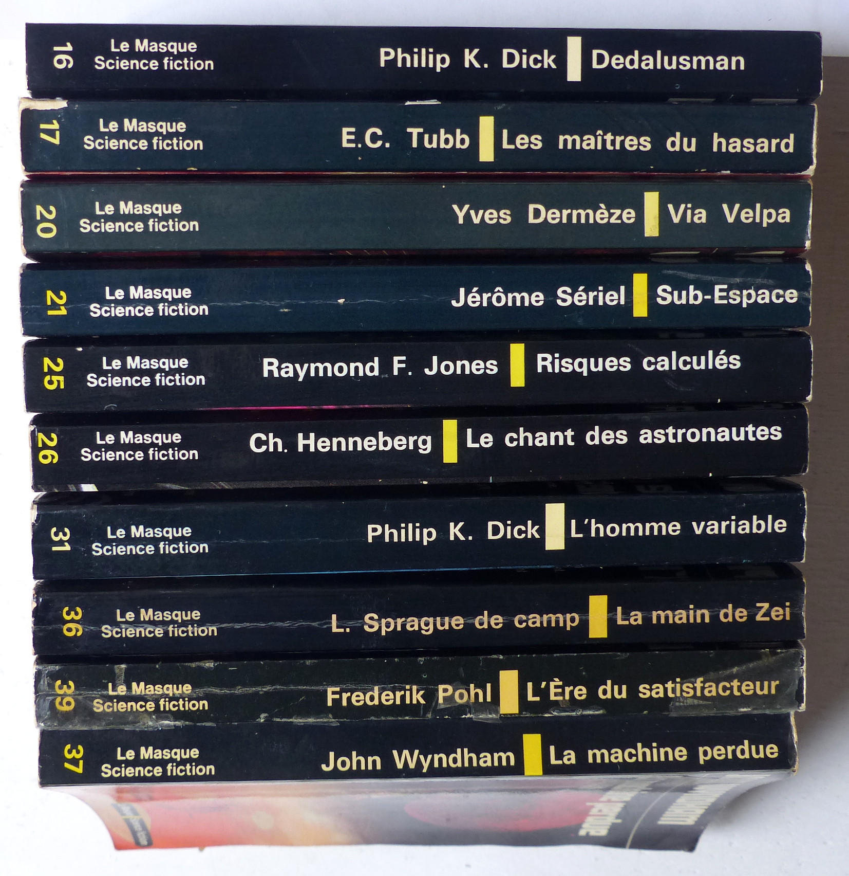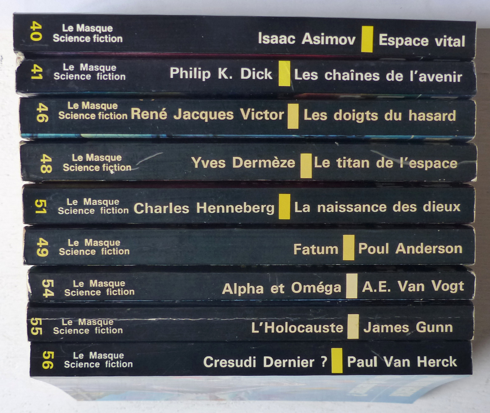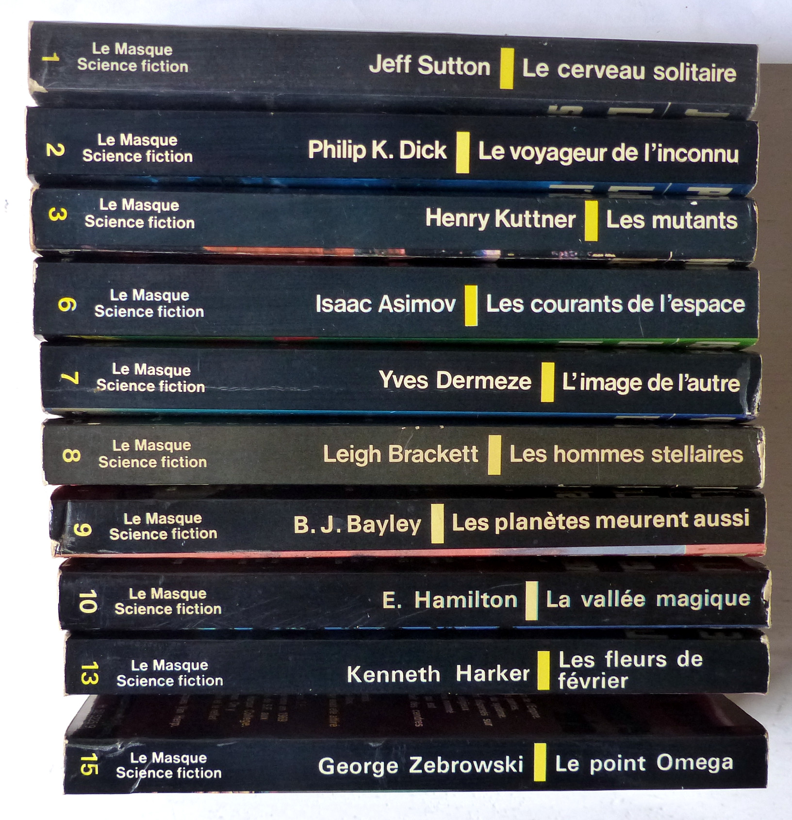 38 romans (sur un total de 116 parus dans cette collection) par Jeff Sutton, Philip K. Dick, Henry Kuttner, Isaac Asimov, Yves Dermèze, Leigh Brackett, B.J. Bayley, Edmond Hamilton, Kenneth Harker, George Zebrowski, E.C. Tubb, Jérôme Sériel, Raymond F.Jones, Nathalie Ch. Henneberg, L. Sprague de Camp, Fredrik Pohl, John Wyndham, René Jacques Victor, Poul Anderson, A.E. Van Vogt, James Gunn, Paul Van Herck, Fritz Leiber, Theodore Sturgeon, Keith Roberts, Frank Herbert, Jack Vance, Keith Laumer. n°1-2-3-6-7-8-9-10-13-15-16-17-20-21-25-26-31-36-39-40-41-46-48-49-51-54-55-56-67-72-73-75-77-88-90-103-107 (le détail des titres est visible sur les photos associées à l'annonce)
