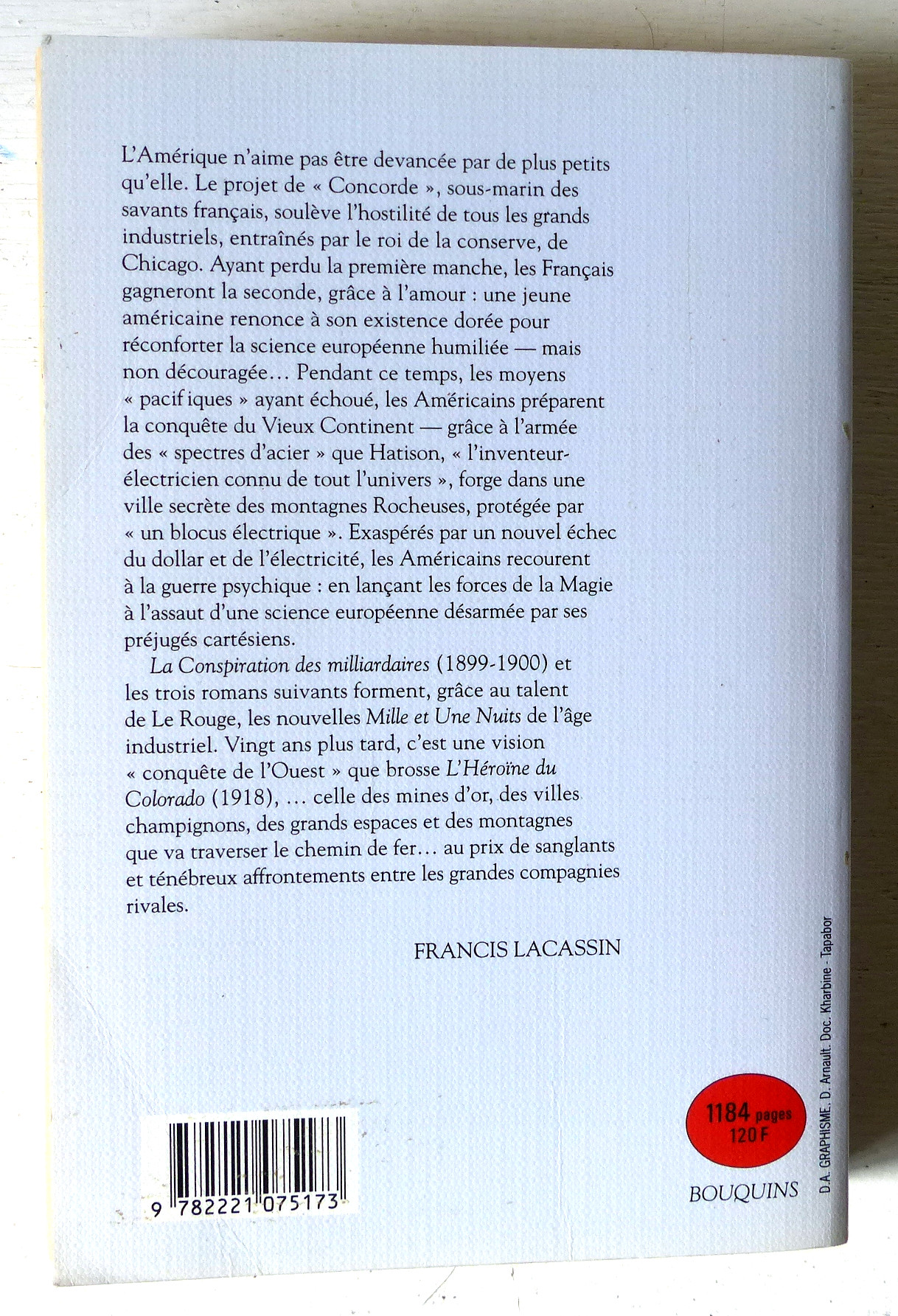 Recueil de 5 romans ('La conspiration des milliardaires', 'A coups de milliards', 'Le régiment des hypnotiseurs', 'La revanche du vieux monde', 'L'héroïne du Colorado'), complété par des documents (chroniques du 'Monde illustré') et une bibliographie établie par Francis Lacassin
