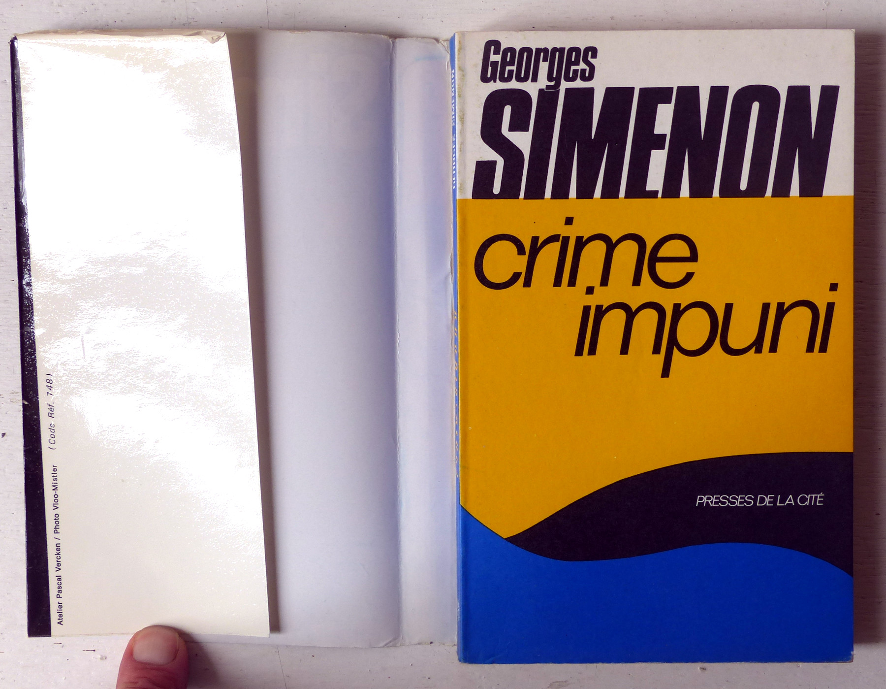 Format poche, couverture ornée de motifs de plusieurs couleurs (blanc, rouge, jaune et noir), avec jaquette photographique comportant un portrait de Simenon au 2e plat, en bon état (légère usure en haut et bas du dos de la jaquette)