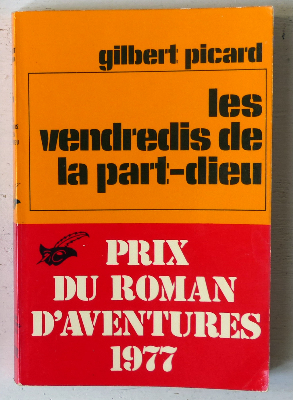 Format poche, couverture jaune et bandeau rouge en bas portant la mention 'Prix du roman d'aventures 1977'