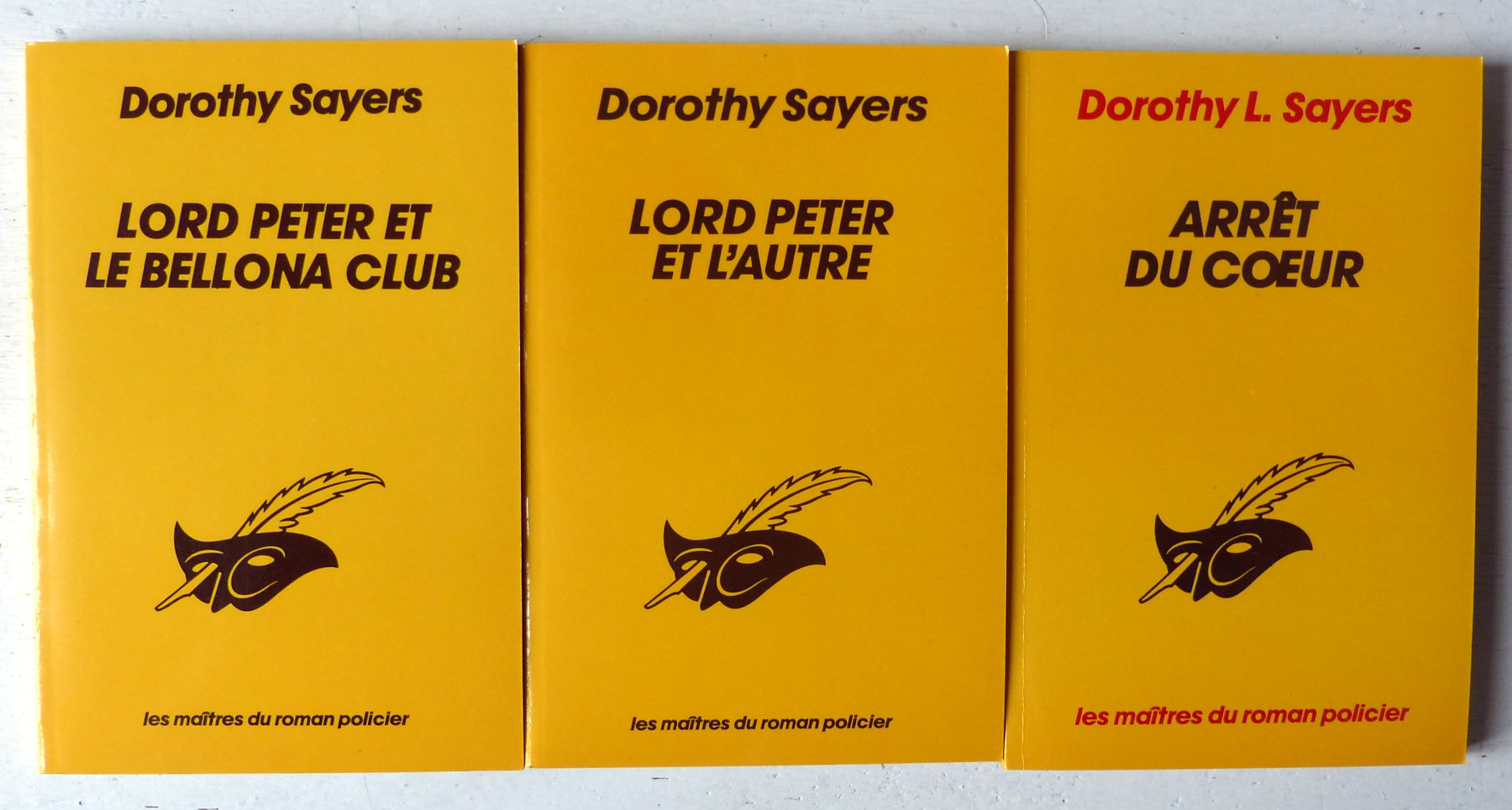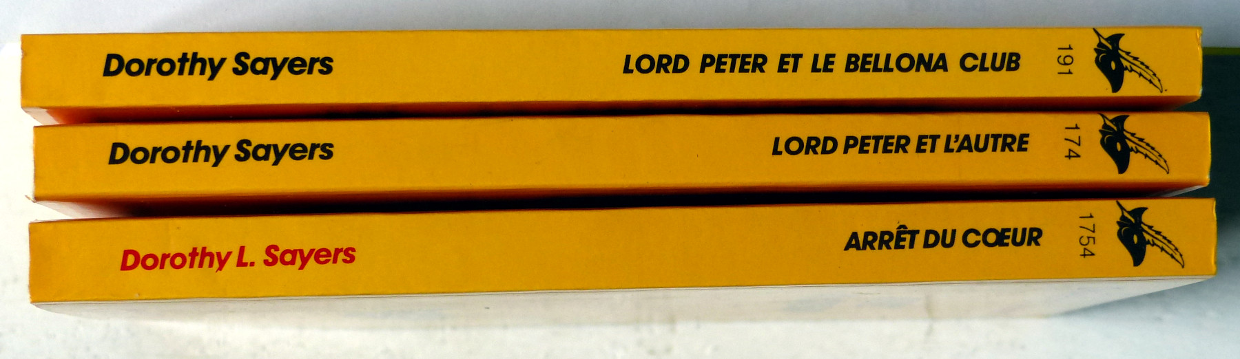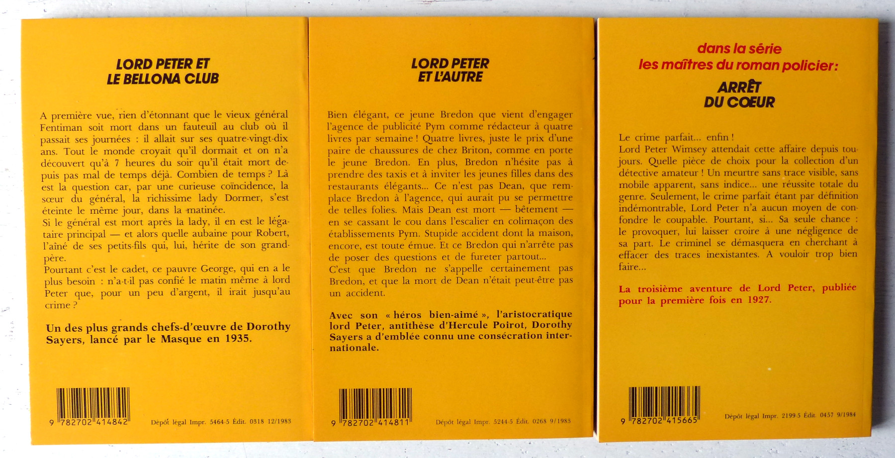Trois enquêtes de Lord Peter: n°174/Lord Peter et l'autre (Murder must advertise, 1983, 224 p.); 191/ Lord Peter et le Bellona Club (The Unpleasantness at the Bellona Club, 1983, 192 p.); 1754/ Arrêt du coeur (Unnatural Death, 1984, 224 p.)