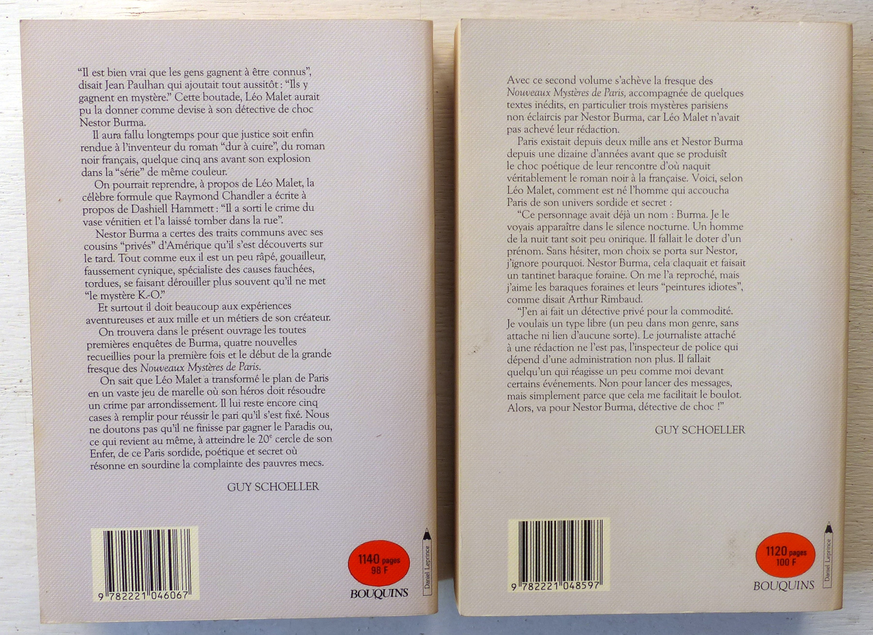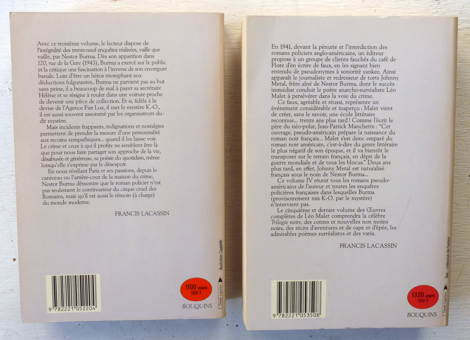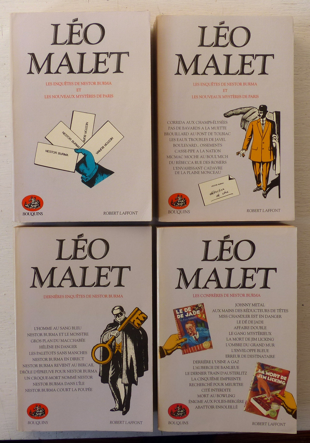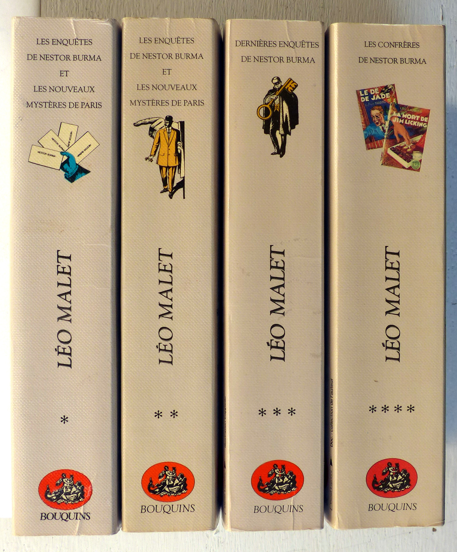 Ensemble des 4 premiers volumes des oeuvres complètes de Léo Malet (édition établie par Francis Lacassin), qui regroupe l'intégralité des enquêtes de Nestor Burma (y compris le cycle des Nouveaux Mystères de Paris) et de ses confrères (Johnny Metal, le commissaire Raffin, etc.). Chaque volume est complété par des documents, une bibliographie et une filmographie.