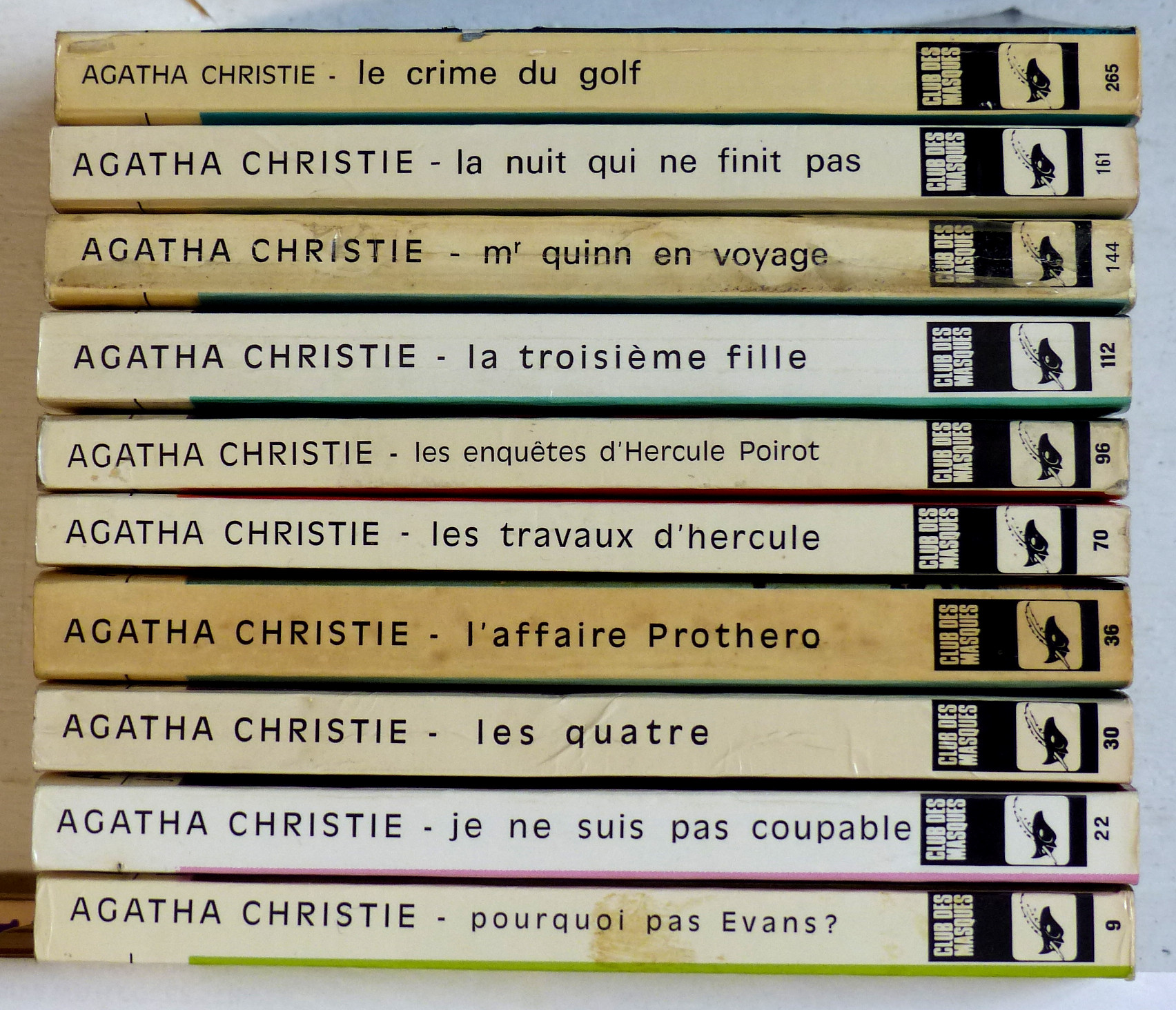 Ensemble de 10 romans et recueils de nouvelles, dont une partie avec Hercule Poirot. N°9-22-30-36-70-96-112-144-161-265. --Pourquoi pas Evans? Je ne suis pas coupable; Les quatre; L'affaire Prothero; Les travaux d'Hercule; Les enquêtes d'Hercule Poirot; La troisième fille; Mr Quinn en voyage; La nuit qui ne finit pas; Le crime du golf.